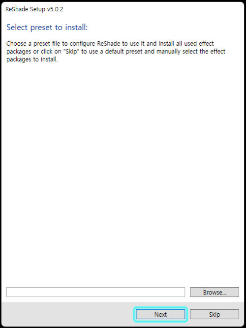 설치할 프리셋을 이미 다운로드한 상태라면 Broswe 버튼을 클릭하여 해당 프리셋을 선택합니다.
