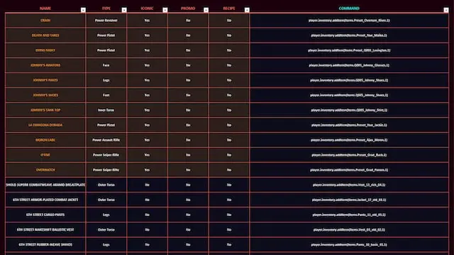 - Item Strings - WIP Organised Spreadsheet: 테스트 완료된 아이템은 엑셀 파일로 정리합니다. 상징적인 무기, 의류 아이템, 대부분의 무기 제작법이 포함되어 있습니다. 약 543 개의 명령이 포함되어 있습니다.