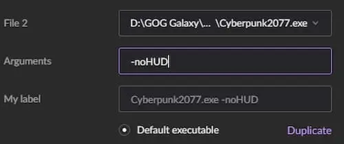 GOG > Manage Installation > Configure > Custom executables / arguments > Add another executable / arguments > 사이버펑크 실행 파일 및 Arguments 설정 > Default executable 체크.