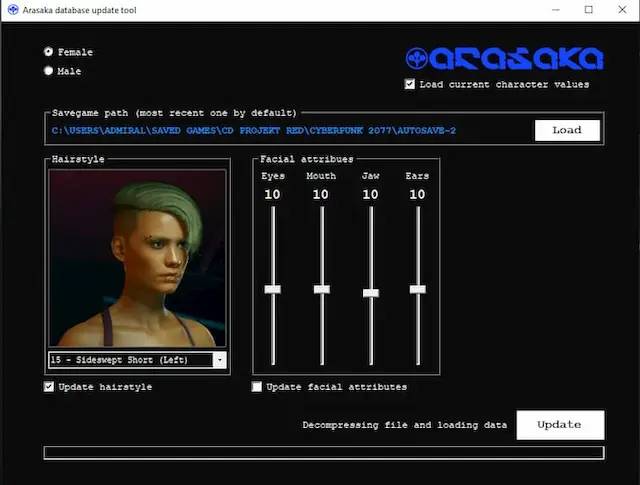 Simple .exe file which automatically selects your latest save file ready to be changed. This Updater can change hairstyle as well as some facial features. It will be updated along the way!
