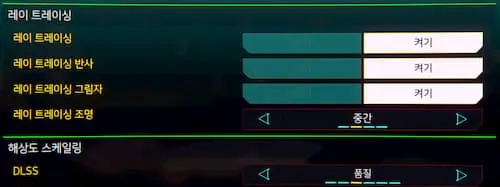 레이 트레이싱은 모두 켰고, DLSS는 품질로 고정했습니다. 자동으로 설정 시 다른 것들이 프레임에 영향을 줄 것 같았습니다.