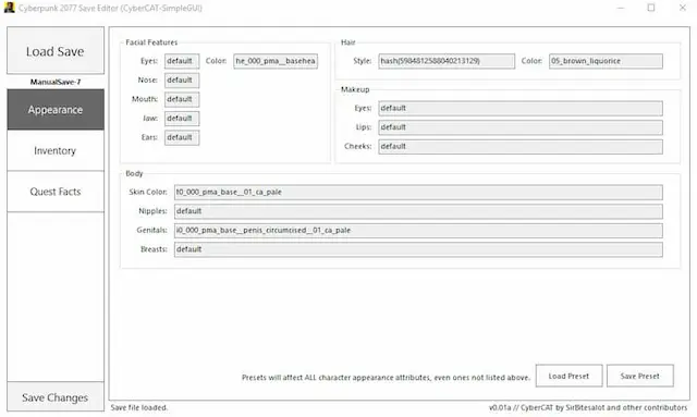 세이브 파일을 불러오면, 세이브 에디터에서 원하는 변경 사항을 수행합니다. 예를 들어, 플레이어 스탯 수정, 외모 프리셋 저장 및 불러오기, 인벤토리 아이템 편집, 퀘스트 사실 수정 등을 할 수 있습니다.