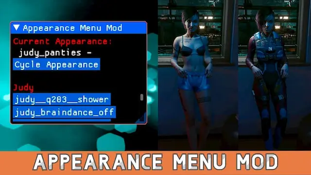 외모 메뉴 모드(Appearance Menu Mod)를 사용하면 목록에서 프리셋을 선택하여 메인 NPC의 의상을 변경 또는 저장할 수 있습니다. 또한 외모 순환(Cycle Appearance) 버튼으로 NPC의 외모를 랜덤 하게 변경할 수 있습니다.