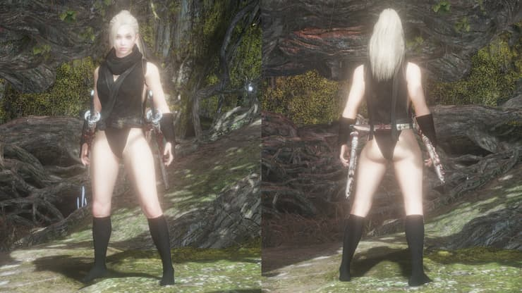 이 모드는 소매 없는 시노비 로브, 검은색 속옷에 도적의 경갑 스커트, 검은색 양말에 시노비 각반 (부츠)를 제공합니다.