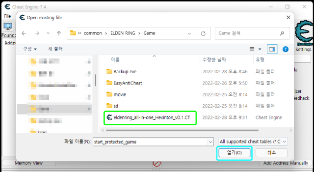 6. 모드 페이지에서 다운로드한, 치트 엔진 테이블을 선택합니다.