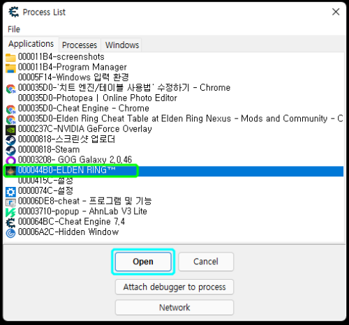 4. 이제 프로세스 목록 창이 열리면, "엘든 링" 프로세스를 선택합니다. (처음 8 자리 숫자 / 문자는 다를 수 있습니다.)