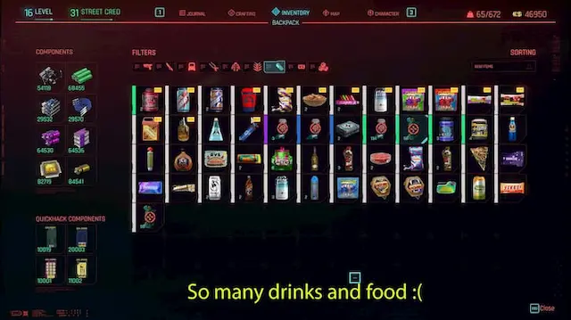 사이버펑크 2077에서 다양한 식품 아이템이 있는 것은 반길 일이지만, 이 아이템들을 유용하고 편하게 사용할 수 있는 UI가 뒷받침되지 않는 것 같습니다. 따라서 소모품들을 거의 사용하지 않고 있었습니다.