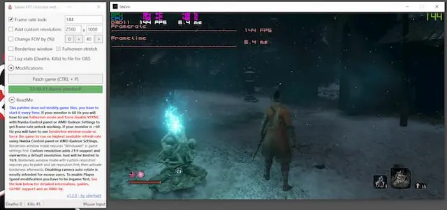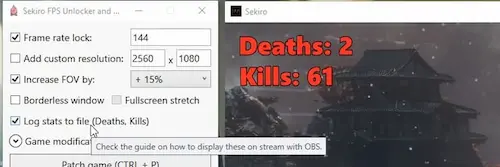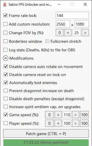 A small utility to remove frame rate limit, add custom resolutions (widescreen support), increase FOV, borderless window, display and log stats and various game modifications for Sekiro - uberhalit...