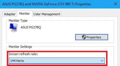 3. 모니터(Monitor) 탭으로 전환하여 모니터가 가능한 최고 화면 주사율로 설정되어 있는지 확인하십시오.