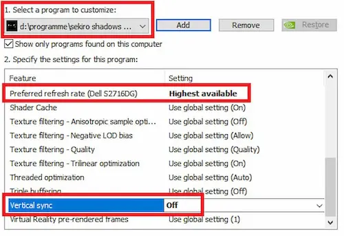 Nvidia Control Panel을 사용하여 Sekiro Profile에서 'Vsync'를 'Off'로, 'Preferred Refreshrate'를 'Highest available'로 설정하십시오.