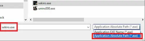 9. 파일 형식을 "Application Absolute Path"로 변경하고, "sekiro.exe"로 이동하여 선택하십시오.
